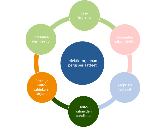 Kaikki toimijat noudattavat samoja ohjeita, ja infektiotorjunnan perusperiaatteet ovat yhteneväiset kaikissa palveluissa: ensihoidosta sairaalahoitoon, avopalveluista osastohoitoon ja kotiin vietäviin palveluihin.