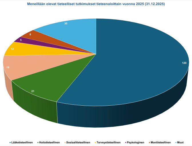Keski-Suomen hyvinvointialueella on meneillään monia terveyttä ja hyvinvointia edistäviä tutkimuksia monella eri tieteenalalla. Vuonna 2025 meneillään olevia tieteellisiä tutkimuksia oli yhteensä 215 (päivitetty 31.12.2025). Keski-Suomen hyvinvointialue siis on merkittävä Suomalainen terveyttä ja hyvinvointia edistävä tutkimusorganisaatio kansallisella tasolla. Kaikki vuoden 2025 meneillään olevat tieteelliset tutkimukset löytyvät täältä: Meneillään olevat tutkimukset vuonna 2025 (päivitetty 31.12.2025). Tieteellisiksi tutkimuksissa on luokiteltu väitöskirjatutkimukset tai sitä korkeampi tasoiset tutkimukset. Meneillään olevien tutkimusten määrä perustuu tutkimusluparekisteriin, joka sisältää tiedon vain tutkimuksista, joille on myönnetty tutkimuslupa Keski-Suomen hyvinvointialueen tutkimuspalveluiden kautta. Excel-tiedosto ei sisällä tietoja tutkimuksista, joille ei ole haettu tutkimuslupaa Keski-Suomen hyvinvointialueen tutkimuspalveluista.