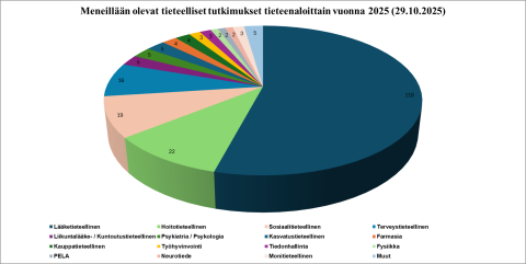 Keski-Suomen hyvinvointialueella on meneillään monia terveyttä ja hyvinvointia edistäviä tutkimuksia monella eri tieteenalalla. Vuonna 2025 meneillään olevia tieteellisiä tutkimuksia on yhteensä 206 (päivitetty 29.10.2025). Keski-Suomen hyvinvointialue siis on merkittävä Suomalainen terveyttä ja hyvinvointia edistävä tutkimusorganisaatio kansallisella tasolla. Kaikki vuoden 2025 meneillään olevat tieteelliset tutkimukset löytyvät täältä: Meneillään olevat tutkimukset vuonna 2025 (päivitetty 29.10.2025).  Tieteellisiksi tutkimuksissa on luokiteltu väitöskirjatutkimukset tai sitä korkeampi tasoiset tutkimukset. Meneillään olevien tutkimusten määrä perustuu tutkimusluparekisteriin, joka sisältää tiedon vain tutkimuksista, joille on myönnetty tutkimuslupa Keski-Suomen hyvinvointialueen tutkimuspalveluiden kautta. Excel-tiedosto ei sisällä tietoja tutkimuksista, joille ei ole haettu tutkimuslupaa Keski-Suomen hyvinvointialueen tutkimuspalveluista.